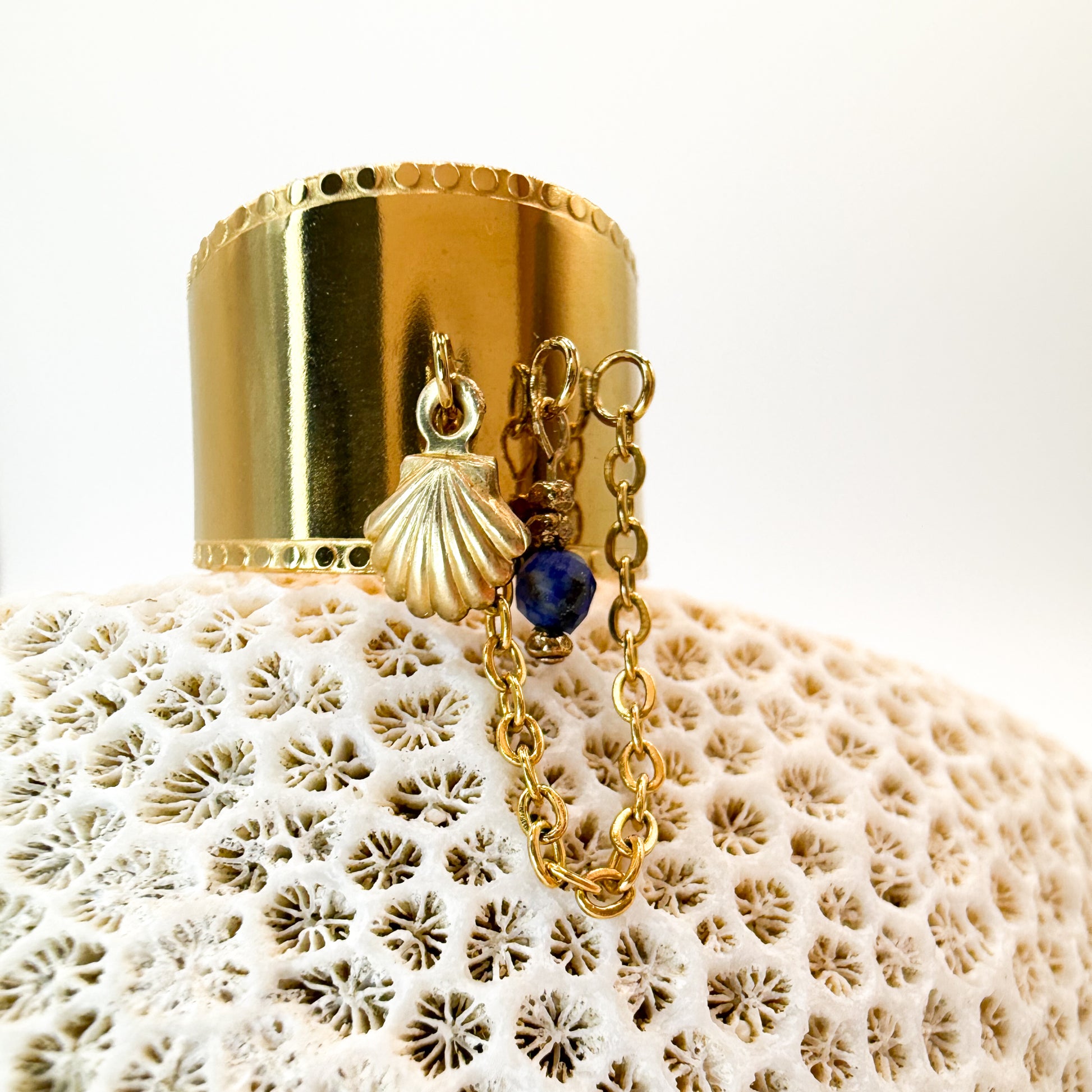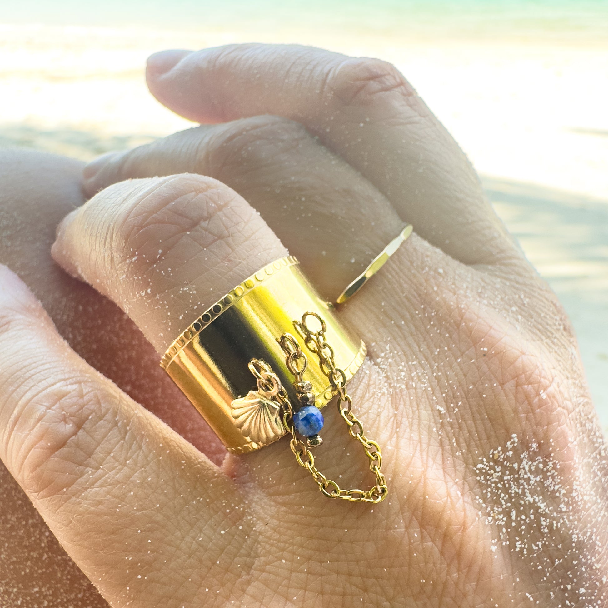 Pimper votre summer look avec la Bague Océane! Avec sa breloque coquillage et pierre lapis lazuli, cette bague large réglable ajoutera une touche d'élégance et d'originalité à votre tenue. Parfait pour les amoureux de la mer et de la mode!