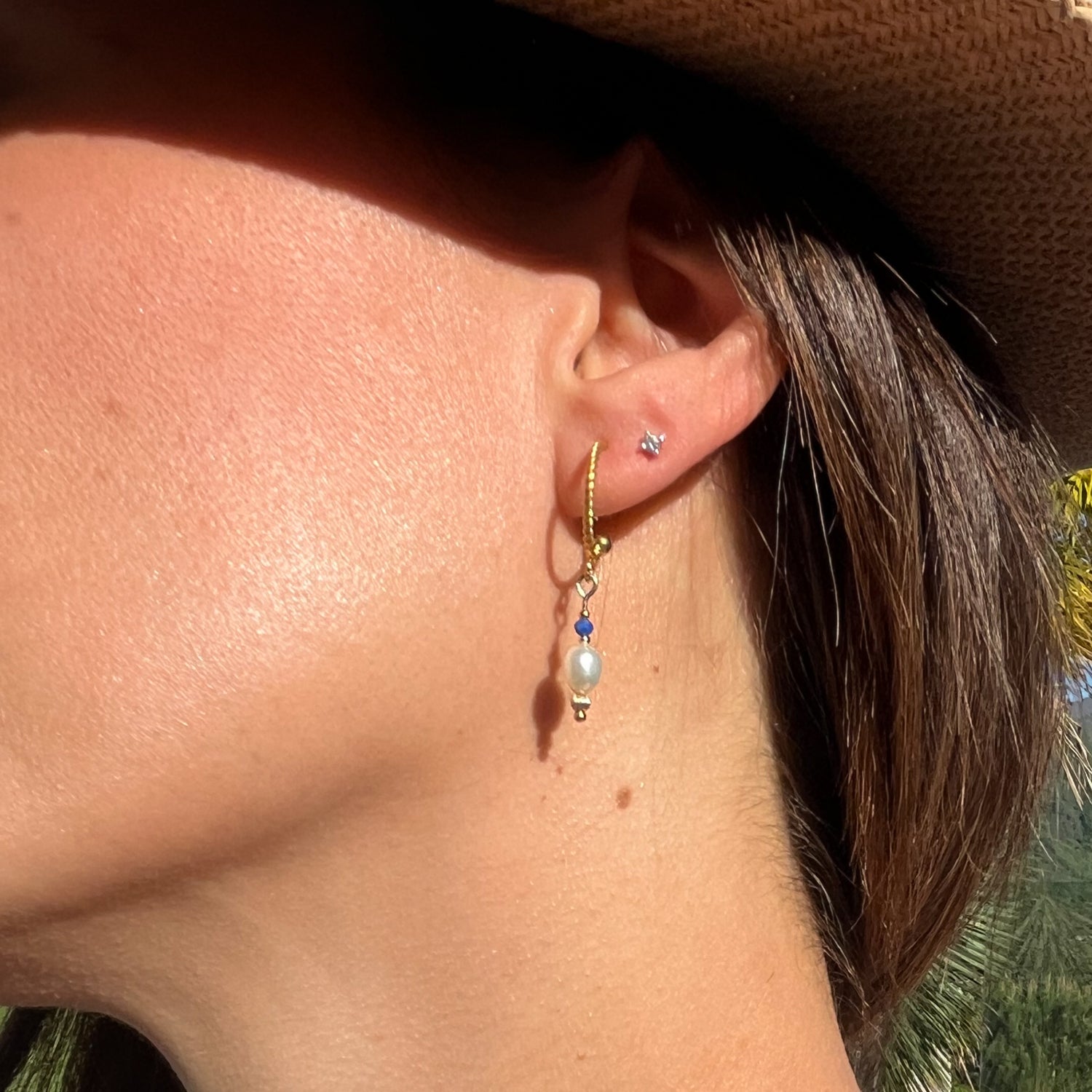 Sublimez votre look avec les Boucles d'oreilles Athena. Un look été avec sa perle nacrée, pierre précieuse lapis-lazuli et acier inoxydable. Une pièce parfaite pour une allure unique et inoubliable.