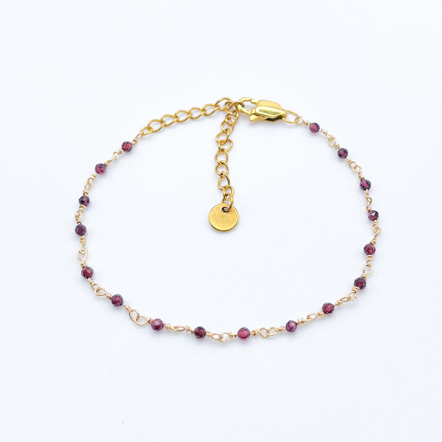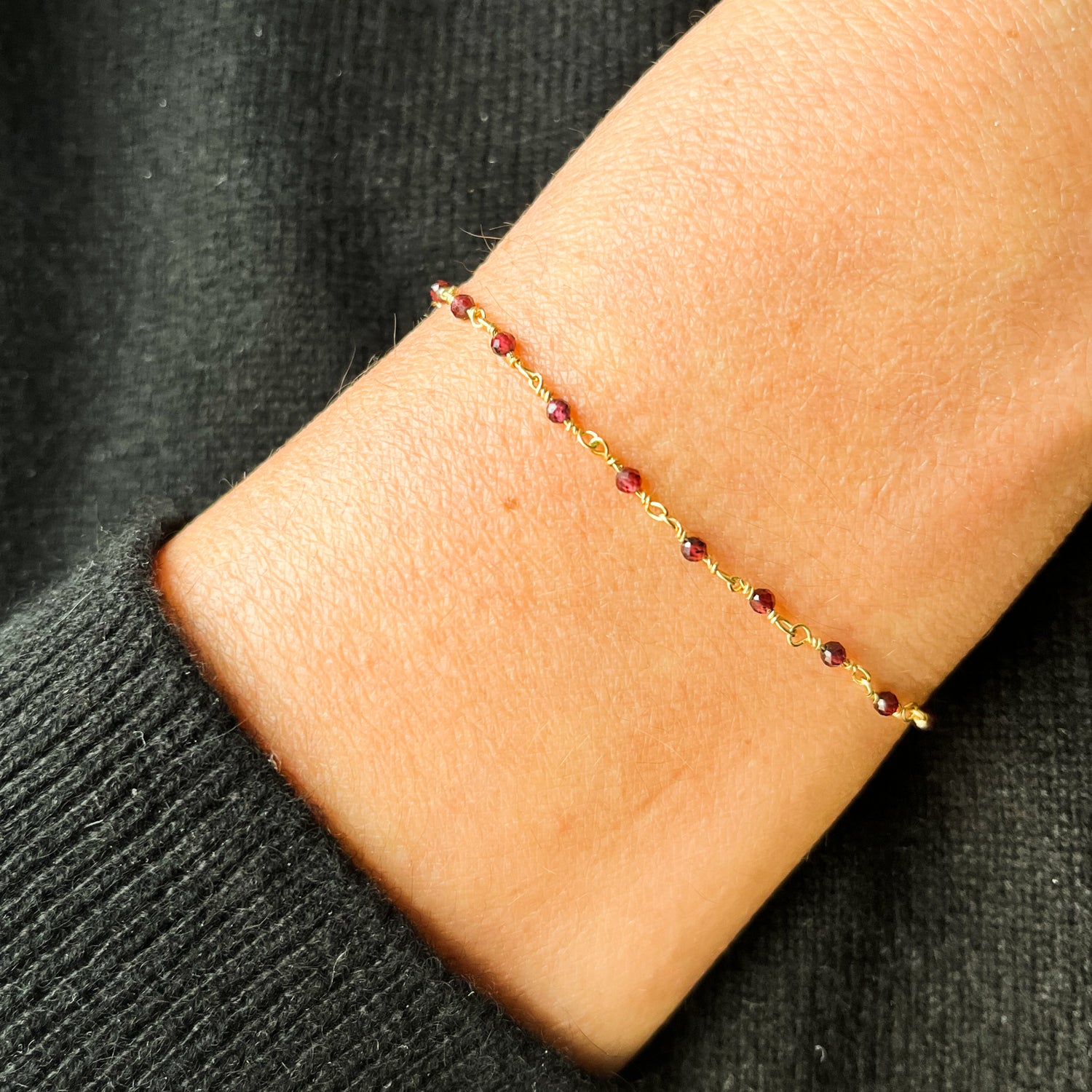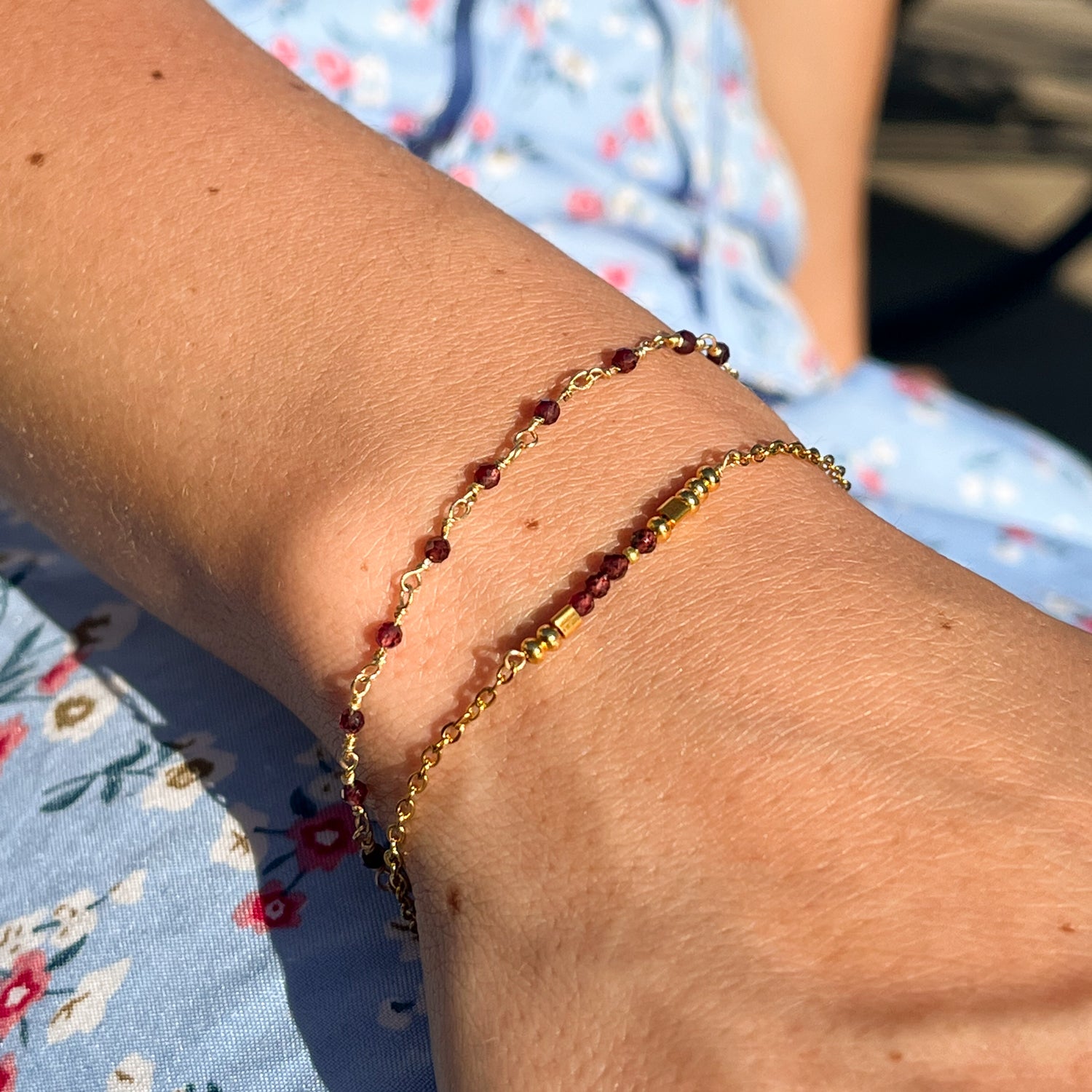 Découvrez notre Bracelet Emma! Avec son fil or rempli et ses pierres précieuses grenat, ce bijou discret est une déclaration subtile d'élégance et de sophistication.
