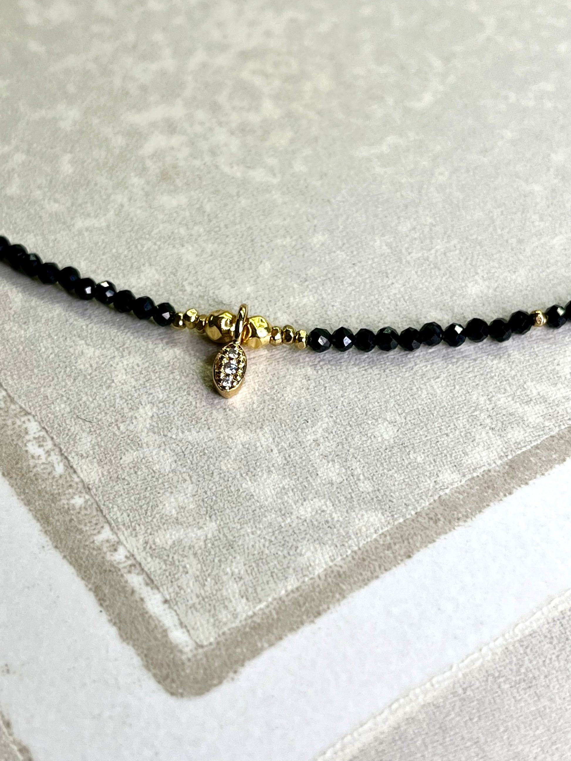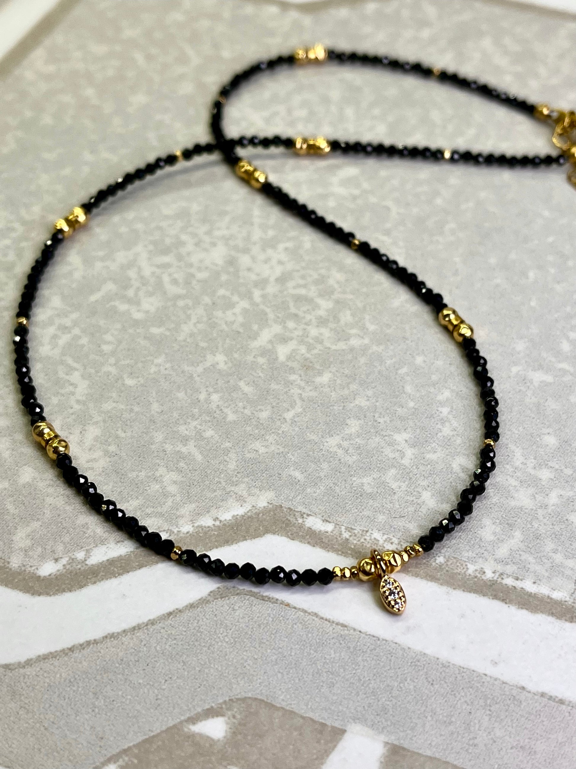 Le collier Azalée est composé de pierres en onyx rondes et facettées pour un éclat sans pareil avec de belles perles en or 3 microns et zirconium.