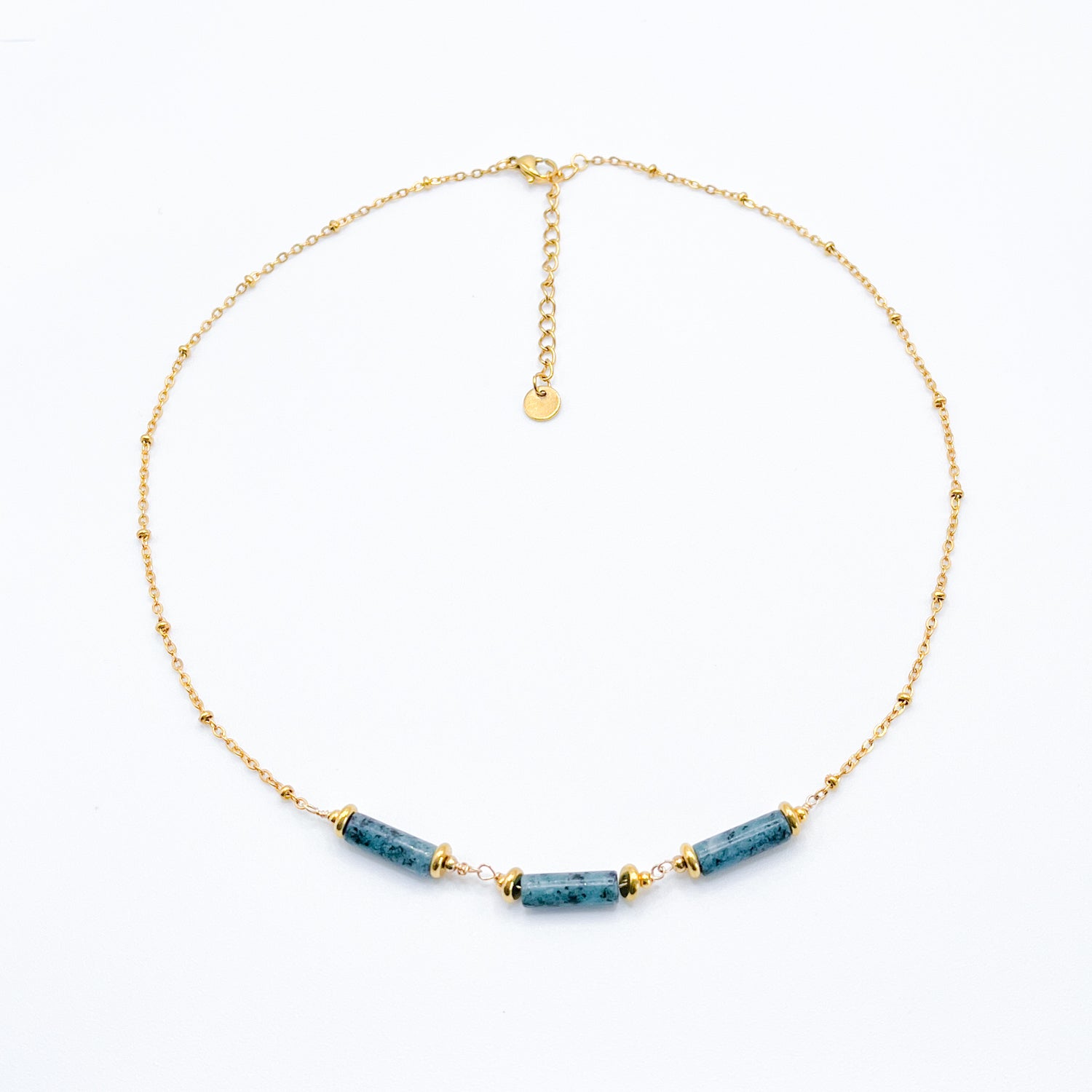 Le Collier Maya avec ses pierres naturelles jaspe dalmatien bleu turquoise et sa chaine boule doré est peut-être la pièce parfaite pour vous! Fabriqué à partir de matériaux de qualité, il est durable et élégant. Il est le mélange parfait de style et de qualité.
