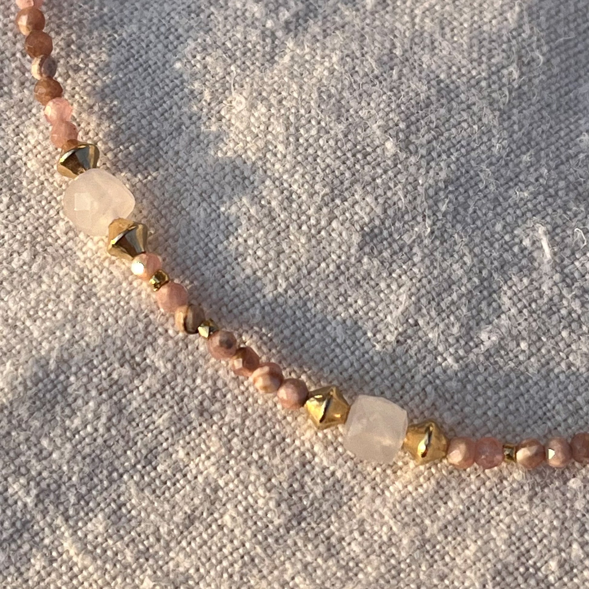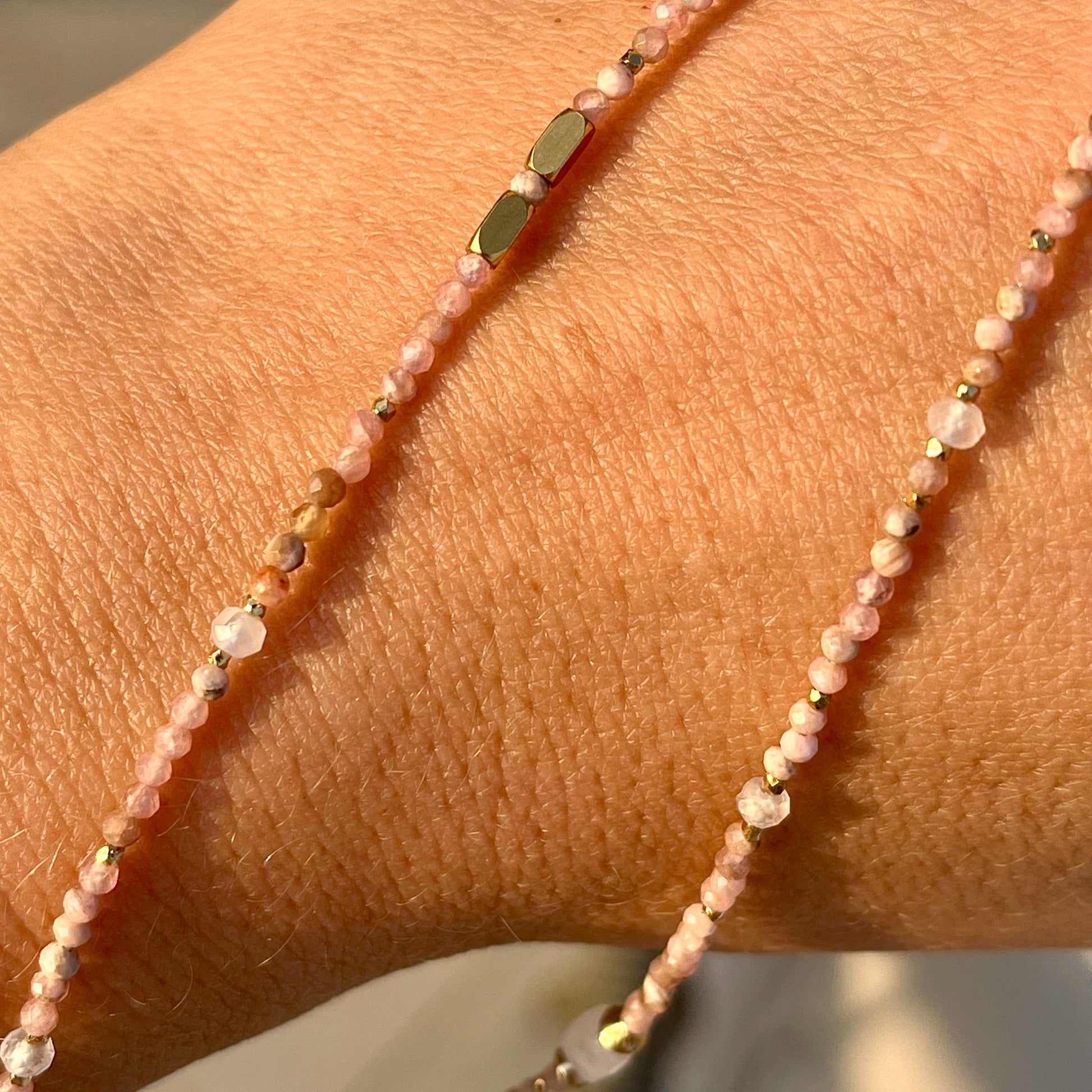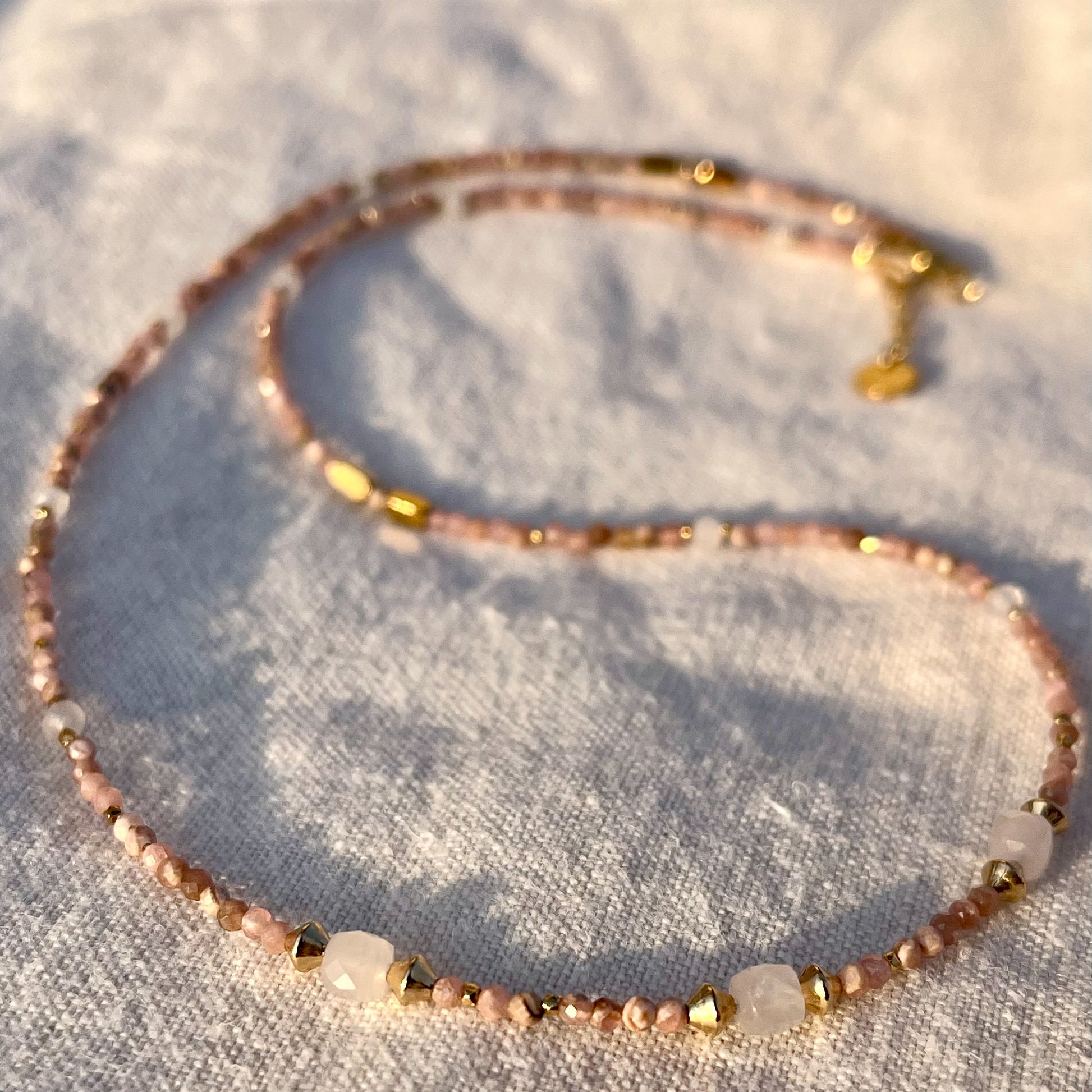 Le collier Rosa, composé de quartz rose et de rhodochrosite, allie élégance et bien-être. Le quartz rose, pierre de l’amour, et la rhodochrosite, symbolisant la guérison émotionnelle, apportent douceur et sérénité à celui qui le porte. Idéal pour ajouter une touche de raffinement à votre look tout en cultivant l’harmonie intérieure. Offrez-le ou offrez-vous ce bijou précieux et apaisant.